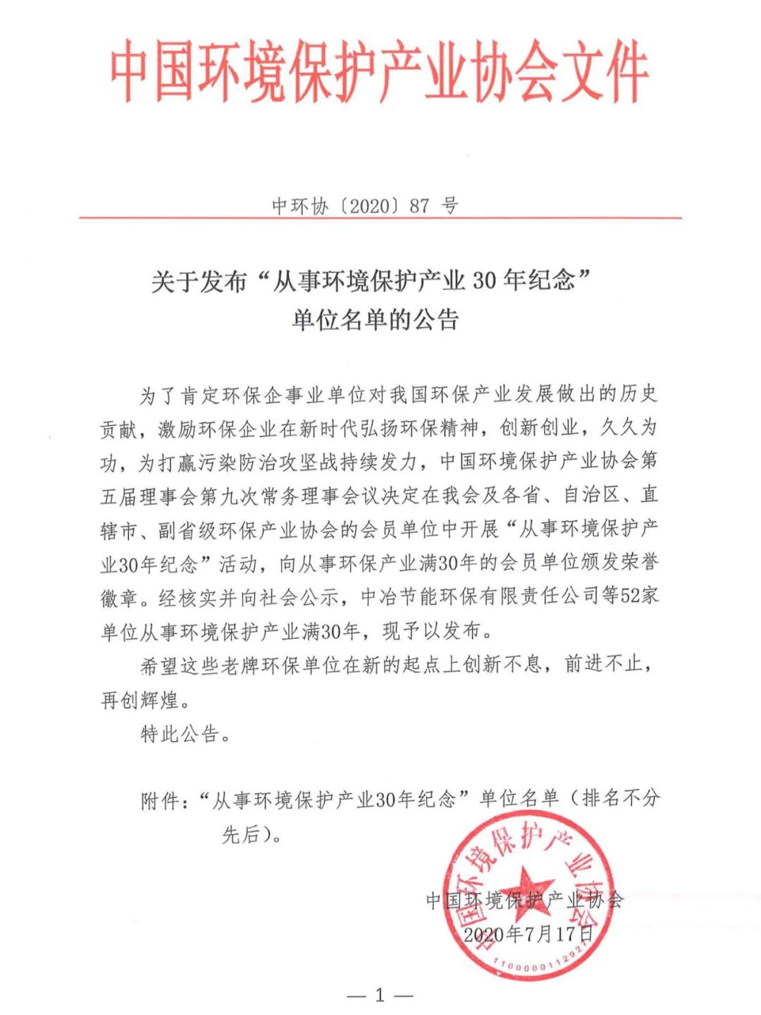 7月17日,中國環(huán)境保護(hù)產(chǎn)業(yè)協(xié)會發(fā)布“從事環(huán)境保護(hù)產(chǎn)業(yè)30年紀(jì)念”單位名單公告,廣州市環(huán)境保護(hù)設(shè)備廠有限公司榜上有名。據(jù)了解,為了肯定環(huán)保企事業(yè)單位對我國環(huán)保產(chǎn)業(yè)發(fā)展做出的歷史貢獻(xiàn),激勵環(huán)保企業(yè)在新時代弘揚(yáng)環(huán)保精神,創(chuàng)新創(chuàng)業(yè),久久為功,為打贏污染防治攻堅戰(zhàn)持續(xù)發(fā)力,中國環(huán)境保護(hù)產(chǎn)業(yè)協(xié)會在各省、自治區(qū)、直轄市、副省級環(huán)保產(chǎn)業(yè)協(xié)會的會員單位中開展了“從事環(huán)境保護(hù)產(chǎn)業(yè)30年紀(jì)念”活動,向從事環(huán)保產(chǎn)業(yè)滿30年的會員單位頒發(fā)榮譽(yù)徽章。經(jīng)核實(shí)公示,全國僅有52家企業(yè)單位獲選!