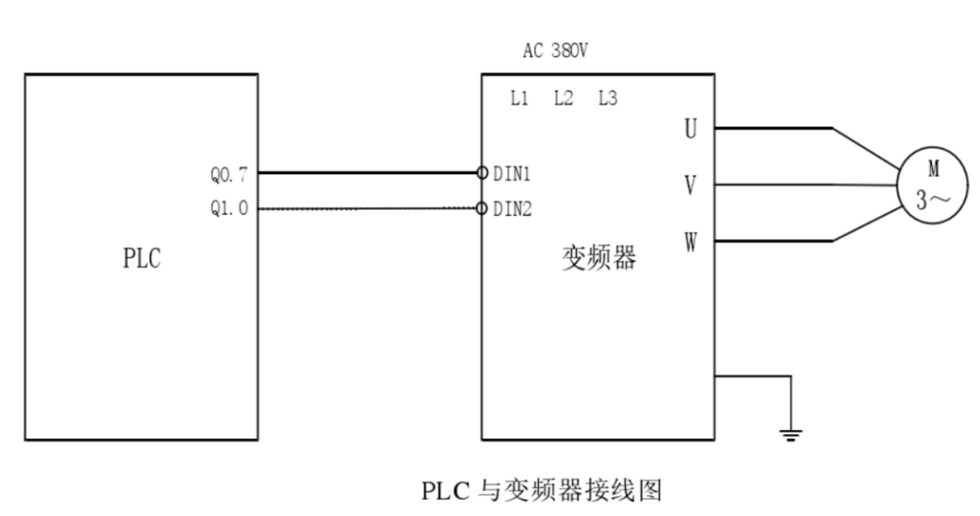 PLC 數(shù)字量輸出端子 Q0.7、Q1.0 分別與變頻器的數(shù)字輸入端口 DIN1、DIN2 相連,設(shè)計PLC 組合輸出端口 Q1.0、Q0.7 的狀態(tài),將風(fēng)機(jī)風(fēng)量分為 3 檔調(diào)節(jié),如下表所示,這樣就完成了一項VOCs廢氣治理工程的變頻風(fēng)機(jī)控制(含編程邏輯)。